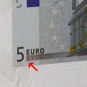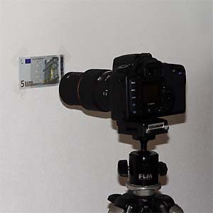 Als Motiv wollte ich einen Gegenstand wählen, der mir feine Details liefert und der jederzeit wieder verfügbar ist, um gegebenenfalls im Nachhinein noch weitere Aufnahmen zum Vergleich machen zu können. Auch für den Leser mag es von Vorteil sein, wenn ein Motiv fotografiert wurde, das ihm bekannt ist. Aus diesem Grund wurde ein 5 Euro Schein gewählt.