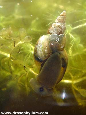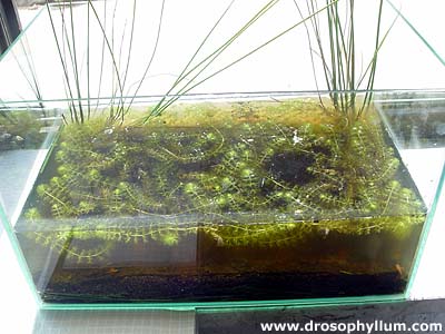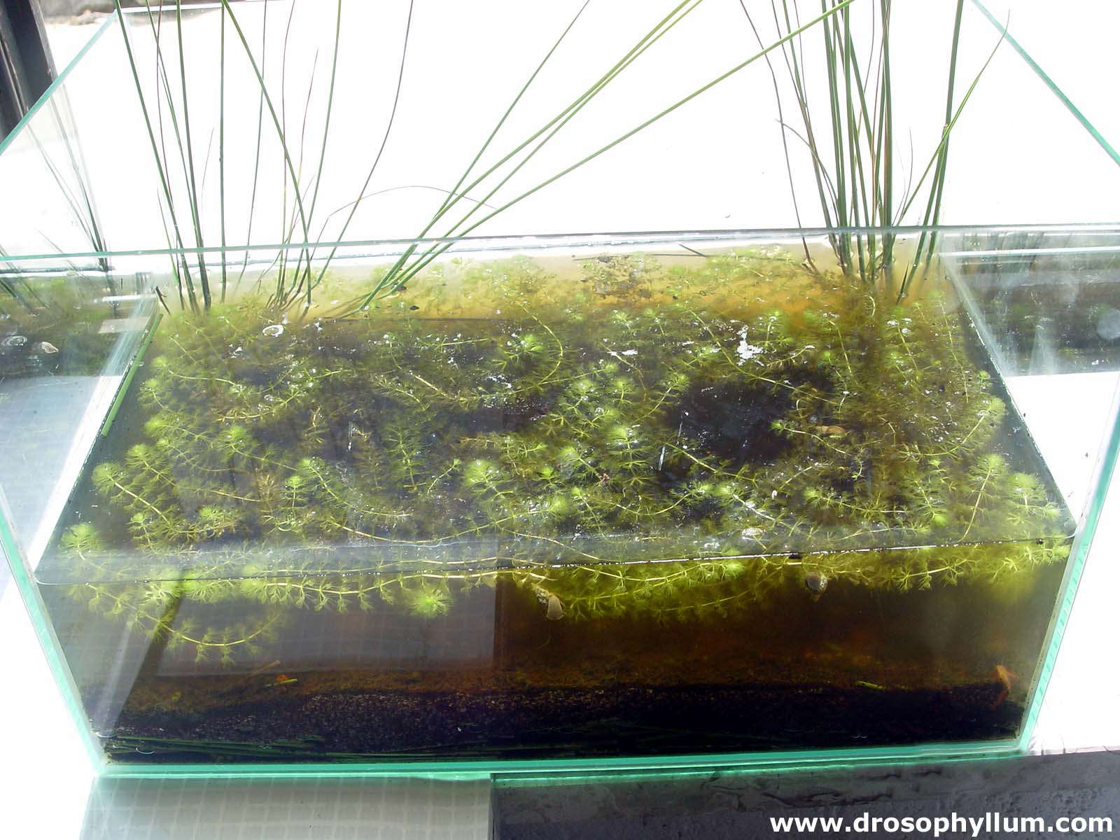 Aldrovanda als Nahrung. Hat man das Becken soweit vorbereitet kann man Aldrovanda einsetzen und muss ca. ein Jahr lang nichts weiter machen als gelegentlich Wasser nachfüllen. Einmal im Jahr, bevorzugt im Frühjahr oder Winter sollte man das Aquarium neu befüllen, da ansonsten die Binsen und der Schneckenkot überhand nehmen. Als Standort empfiehlt sich ein Ost- oder Südfenster oder ein etwas beschatteter Standort im Kalthaus. Bei dem temperierten Klon aus Japan, den ich kultiviere reichen die kürzer werdenden Tage im Herbst sowie eine Überwinterungstemperatur von 15°C aus, damit die Pflanzen zuverlässig Turionen bilden. | ||||||||||||||||||||
