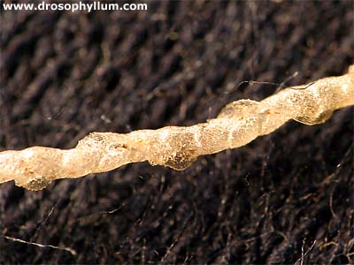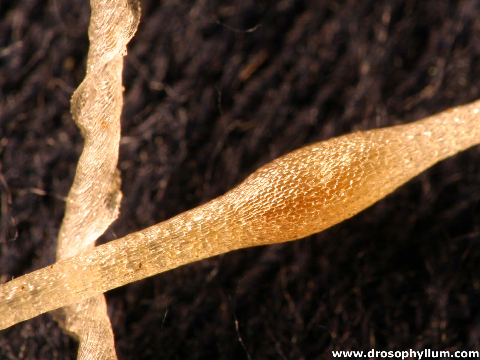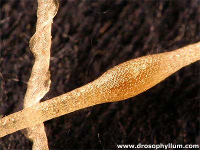 Die unterirdischen Blätter sind deutlich länger und verzweigen sich zum Ende hin Y-förmig. Die Enden sind korkenzieherartig aufgedreht, daher stammt wohl auch der englische Name "corkscrew plant". Entlang der Wendel ist die Falle geöffnet, wobei sehr eng stehende und nach innen gebogene Härchen ein leichtes Eindringen ausreichend kleiner Lebewesen in die Falle ermöglicht, ein Entkommen entgegen der Richtung der Haare allerdings sehr erschweren. Die Reusen führen die gefangene Beute die Röhre entlang nach oben, wo sich ca. auf halbem Wege eine Verdickung befindet. Dieser "Magen" stellt vermutlich die primäre Verdauungszone dar. Die genaue Struktur der Reusenhaare lässt sich am besten unter dem Rasterelektronenmikroskop (REM) beobachten. Ein Bild findet sich beispielsweise auf dieser Seite der Uni Rostock. Noch immer
