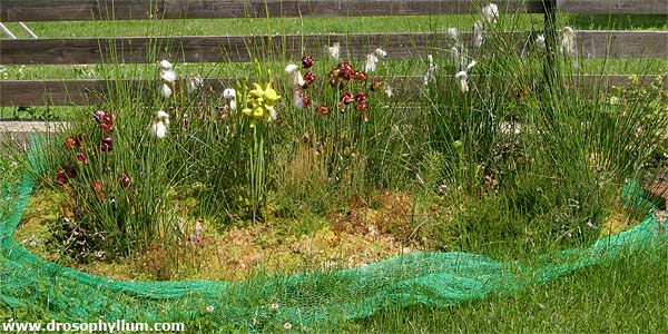 Mit den Venusfliegenfallen, Dionaea muscipula, habe ich gemischte Erfahrungen gemacht. Sie sind erstaunlicherweise recht winterhart, allerdings habe ich die meisten davon zwischen das Sphagnum Moos gesetzt, da ich dachte, dass dies das Rhizom im Winter vor Frost schützen würde. Die Pflanzen haben allerdings große Probleme mit dem Moos mitzuhalten und werden oft davon erstickt. Auch werden die Pflanzen durch die kürzere Wachstumsperiode nicht annährend so groß wie getopfte Pflanzen, die den Sommer im Gewächshaus verbringen und den Winter im Haus. Trotzdem gelangen die Pflanzen zur Blüte und setzen auch Samen an. Auch die Fallen sind stets gefüllt.