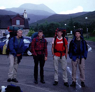 Das sind wir. Noch frisch und fröhlich, kurz vor dem Start. Links Tim "Taler", jemand aus meinem Semester. Nummer 2, Hans B, besagter Freund aus alten Schulzeiten, mit dem ich schon einiges überstanden hab (Türkei, Tunesien, Leistungskurs Chemie :o) usw...). Dritter im Bunde war "Hias", den ich ca. 10 Stunden vor dem Abflug kennenlernte und rechts außen meine Wenigkeit. Ach ja, und dann war da noch Wilson, der in der Plastiktüte hinten an meinem Rucksack baumelt. Wilson war der Prügelknabe des Teams, unser Volleyball. |