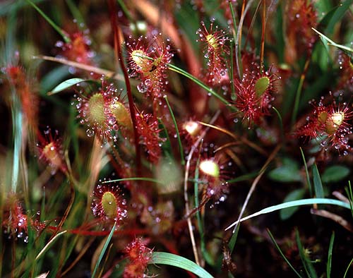 | Und hier mal aus der Nähe. Ich habe allerdings keine Ahnung, ob es sich um Drosera intermedia oder Drosera anglica handelt, wers weiß, soll sich doch mal rühren. |