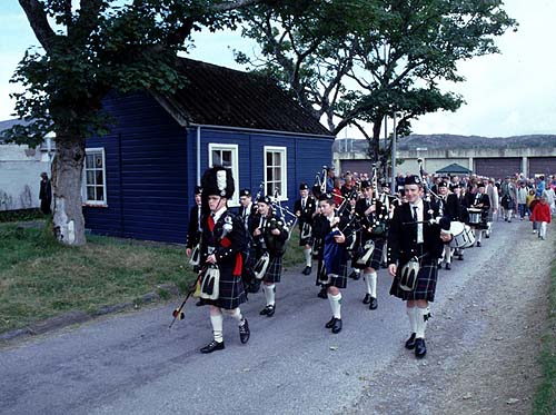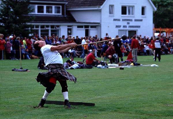 Zwischendurch waren wir auch immer wieder mal in der Zivilisation, alleine schon zum Wäschewaschen und mal heiß duschen. Übernachtet hatten wir aber ausschließlich auf Campingplätzen bzw. in den Bahnhöfen, da die Jugendherbergen stets ausgebucht waren und außerdem irrsinnig viel kosten. Hier zum Beispiel waren wir mal auf einem der Highland-games, wo neben diversen Leichtathletikwettkämpfen auch Disziplinen wie Baumstammwuchten, traditionelle Tänze, Hammerwerfen, Fliegenfischen und noch vieles mehr dazugehören. Das Ganze wird selbstverständlich von Dudelsackmusik begleitet, die die ersten paar Male ganz interessant und "andersartig" klingt, mich aber zumindest zum Schluß doch eher genervt hat. Kein Wunder, sie war ursprünglich ja als "Waffe" zur Demoralisierung der Gegner gedacht. Jaja, die schottische Armee ist eh ein Kapitel für sich ;o) Das aber nicht hierhergehört ! |