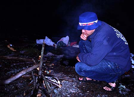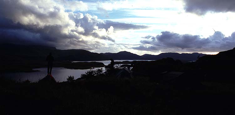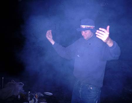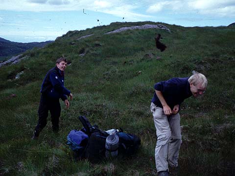 ...oder vielmehr der Rauch. Im Gegensatz zu den völlig wirkungslosen chemischen Mitteln vertreibt dicker Rauch einen Großteil der midges und lieber hockt man mit tränenden Augen und Dauerhusten rum, als daß man alle zwei Sekunden gebissen wird. |