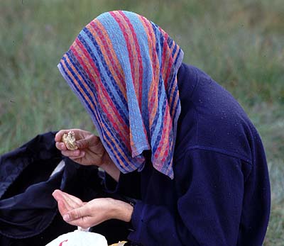Diese Häufchen Elend ist weder eine leprakranke Bettlerin noch Mutter Theresa sondern unser Tim der sich von kleinen, schnucklige Mosquitos, die man in Schottland midges nennt, zu schützen versucht. Und wer einmal im August in den schottischen Highlands war, wird den Namen M_I_D_G_E_S mit Respekt aussprechen. Vielleicht wird der Erzähler sogar kurz in Nachdenken versinken, das Schreckliche noch einmal Revue passieren lassen und sich mit Schaudern erinnern, wie kanpp er dem Tode entrann... Wir jedenfalls waren mitten drin. |