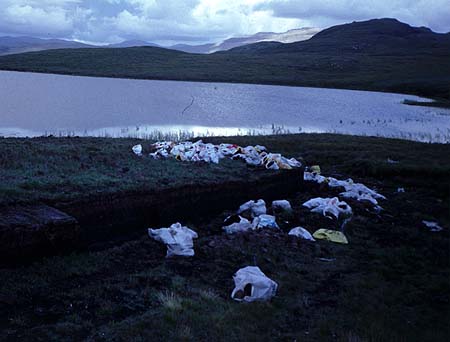 Interessant war bei den ganzen Wanderungen auch immer, daß man sich praktisch ständig in Moore oder moorähnlichen Gebieten aufhielt und diese tagelang durchwandern konnte, ohne auf Zivilisation zu stoßen. Nicht zu vergleichen mit den winzigen deutschen Naturschutzmöorchen. Hier müssen noch gewaltige Mengen an Torf vorhanden sein. Nur einmal entdeckten wir Spuren von Torfabbau und dies schienen private Nutzer zu sein, die wenige Plastiksäcke davon herausstachen. Ich vermute mal zum Verbrennen. In Schottland kann man Torf also wirklich noch als nachwachsenden Rohstoff bezeichnen. Was uns natürlich nicht dazu verleiten sollte, ihn weiterhin so zu vergeuden. |